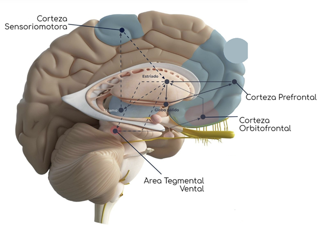 El principal responsable del establecimiento y mantenimiento de hábitos es el estriado. En la exploración y el aprendizaje inicial se involucra la corteza prefrontal, el sistema límbico para la evaluación emocional y el cuerpo estriado. El cuerpo estriado es el encargado de enviar señales al mesencéfalo (área tegmental ventral) para la liberación de dopamina, es decir, una vez hay una evaluación racional y emocional de la conducta y se desea mantener, se activa el sistema de recompensas, lo que le da un valor deseable o positivo.